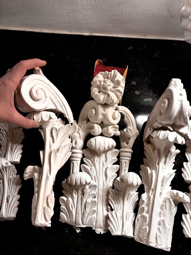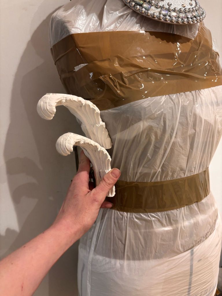 To begin, I sketched out some initial drawings to assess whether it was even possible to execute the design. Once I had a clear vision, I selected a Corinthian cap we had on hand and began moulding specific pieces to fit the dress. I carefully shaped the backs of the elements, trimmed them, and tested their placement on the corset to determine how they would work structurally and aesthetically.